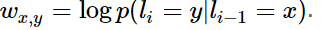该特征函数仅当l_i = y,l_i-1=x时才等于1。这个特征函数的权重如下: