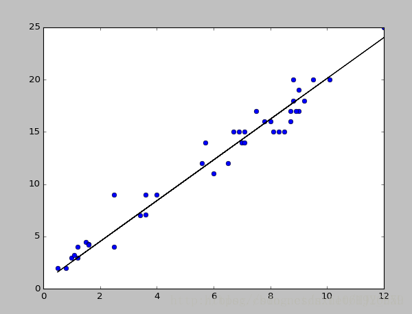 由图可以看出,我们能把方程设为y=b0+b1*x,这样我们就得到了简单线性回归的拟合方程