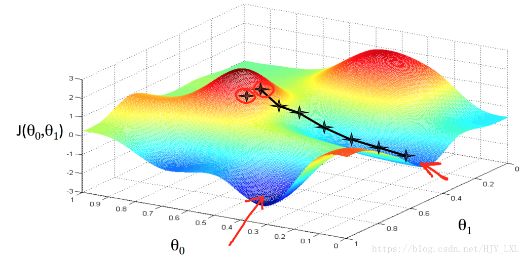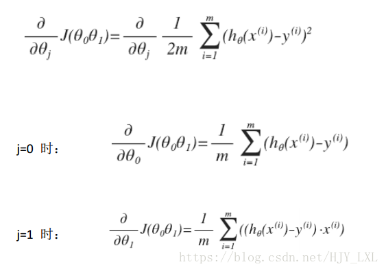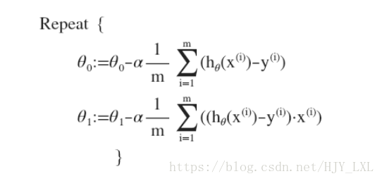 这个算法就是使在图中的一个随机的点沿最小点一直一点一点的下降,然后达到最小点,这样就得到了我们想要的theta值。我们可以使用式子进行计算:
