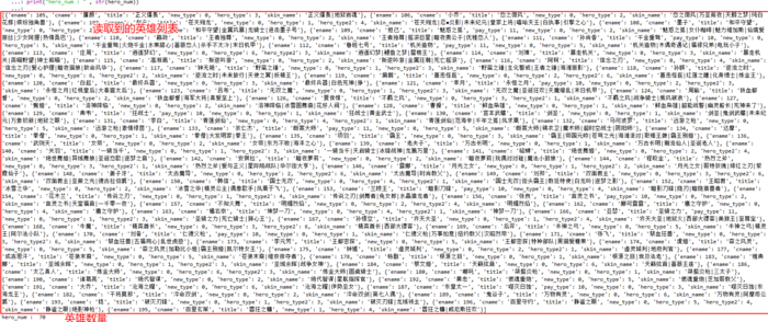 print("hero_num : " , str(hero_num))以上代码读取英雄列表存入hero_json,并获取英雄数量,运行效果如图所示: