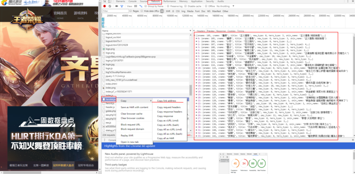 百度“王者荣耀”进入官网,进入https://pvp.qq.com/,按F12进入调试界面,然后按F5刷新界面,图中标识的herolist.json文件就是我们所需要的英雄列表,其中包括英雄编号、英雄名称、英雄类型、皮肤的名称等信息,在文件上右击复制链接http://pvp.qq.com/web201605/js/herolist.json