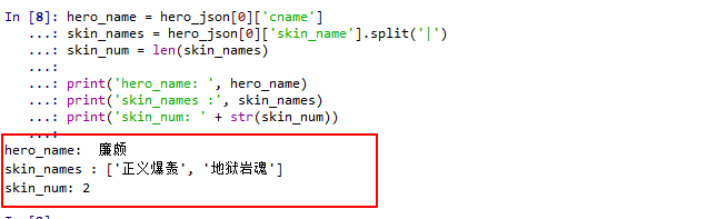 在第一步获取到的herolist.json文件中有“skin_name”字段,我们只要解析这个字段就可以获取皮肤数量和皮肤名称。测试代码(接代码片段1)如下: