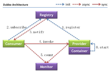 Consumer服务消费者,Provider服务提供者。Container服务容器。消费当然是invoke提供者了,invoke这条实线按照图上的说明当然同步的意思了。但是在实际调用过程中,Provider的位置对于Consumer来说是透明的,上一次调用服务的位置(IP地址)和下一次调用服务的位置,是不确定的。这个地方就需要使用注册中心来实现软负载。