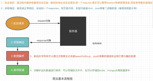 爬虫总共分为四部分,发送请求,获取响应,解析数据,保存数据,如下图: