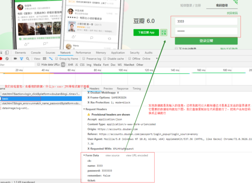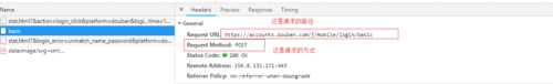url1='https://www.douban.com/' #这是首页的路径url2='https://accounts.douban.com/j/mobile/login/basic' #这是登录发送请求的路径headers={ 'User-Agent':'Mozilla/5.0 (Windows NT 10.0; Win64; x64) AppleWebKit/537.36 (KHTML, like Gecko) Chrome/72.0.3626.119 Safari/537.36'}