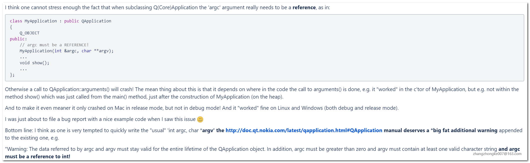 过了一段时间之后,另外一个同事想在mac电脑上来编译工程,却发现编译后的程序死都运行不起来。一运行就报错:EXC_i386_GPFLT QCoreApplication::arguments,又将矛头指向了QCoreApplication的arguments方法,这下我慌了!这下必须要仔细排查下原因,不能假装不知道继续帅锅了!根据关键字EXC_i386_GFLT没用找到什么有用的东西,再一搜Qt QApplication arguments方法崩溃,就找到了一堆的信息,其中Qt bug管理系统上的一个用户吐槽最为详细:
