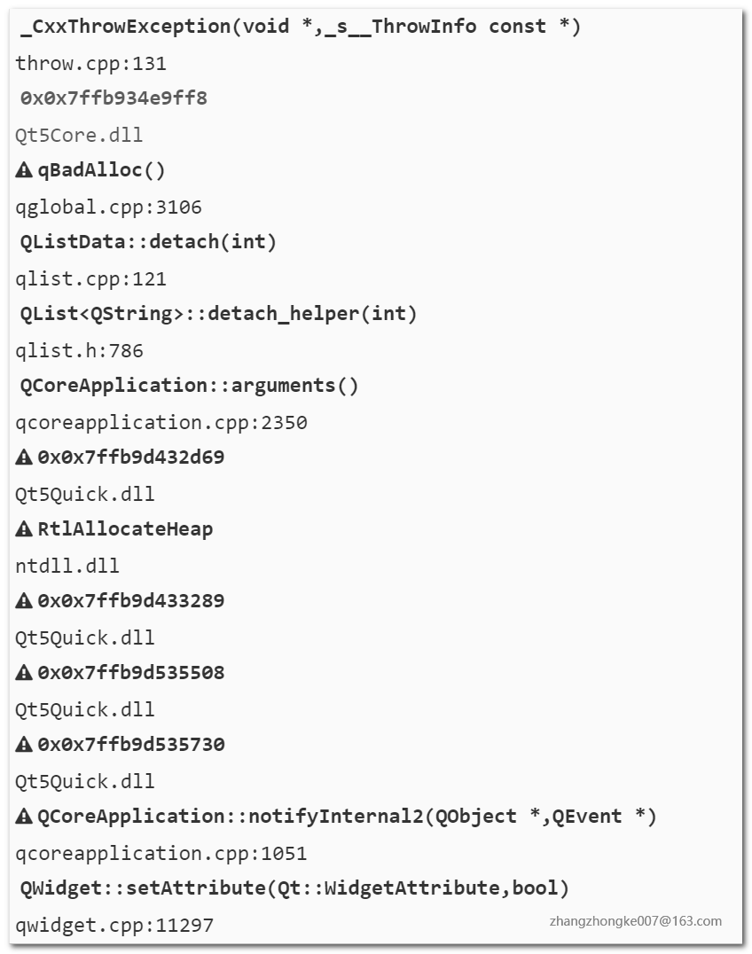 很明显程序在QCoreApplication的arguments()方法中崩溃了。这个崩溃堆栈让我们不由得浮想联翩:难道这个是Qt框架本身的Bug?不小心被我给踩到了?因为我们的程序运行起来之后,没有什么地方会和QCoreApplication的arguments方法打交道啊!这么一想心里顿时好受多了,帅锅技能升华!
