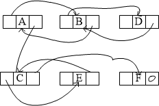 我们再回到上述那个问题,假如我们知道了D,想知道如何访问B,按照我们使用栈的方式,OK,你只能再遍历B以前所有的元素。这种方式真的沙雕。假如我们在第一次遍历时,使得D的空指针指向B(对,就是那个没用到的指针,这个时候用到了)。于是,上述结构变成了这样一种结构: