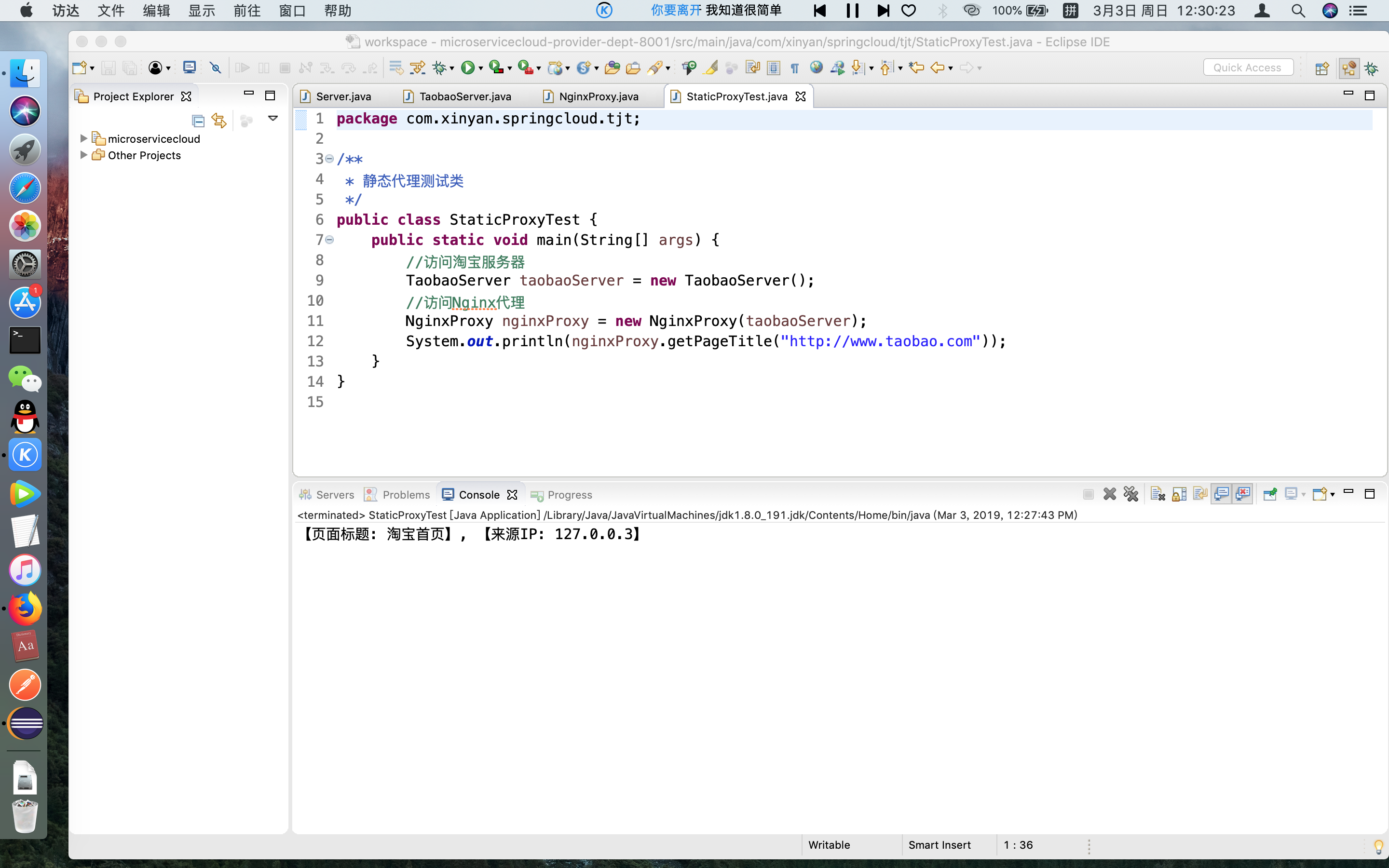 1 /** 2 * 静态代理测试类 3 */ 4 public class StaticProxyTest { 5 public static void main(String[] args) { 6 //访问淘宝服务器 7 TaobaoServer taobaoServer = new TaobaoServer(); 8 //访问Nginx代理 9 NginxProxy nginxProxy = new NginxProxy(taobaoServer);10 System.out.println(nginxProxy.getPageTitle("http://www.taobao.com"));11 }12 }由于淘宝服务器和代理服务器实际上都是服务器,So它们可以使用相同的接口Server;用户不和最终目标对象角色TaobaoServer打交道,而是与代理对象角色NginxProxy打交道,由代理对象角色NginxProxy控制用户的访问;多次运行来源IP会改变,其结果如下: