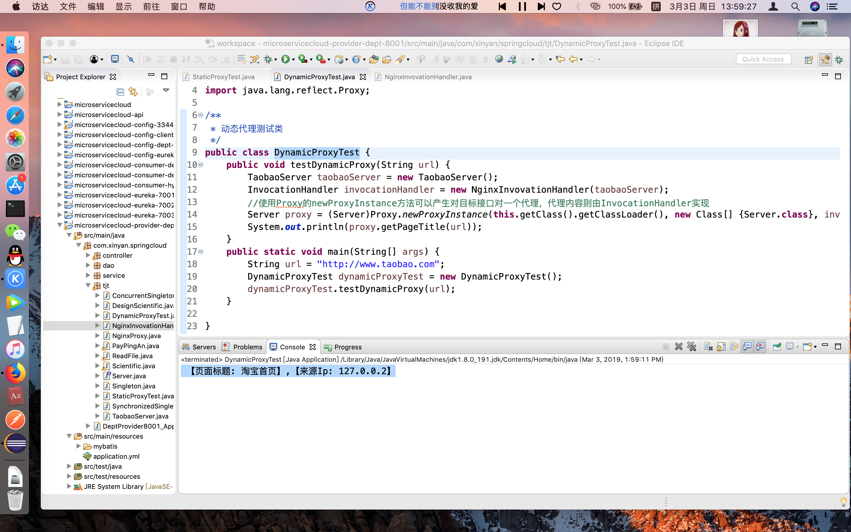 1 import java.lang.reflect.InvocationHandler; 2 import java.lang.reflect.Proxy; 3 4 /** 5 * 动态代理测试类 6 */ 7 public class DynamicProxyTest { 8 public void testDynamicProxy(String url) { 9 TaobaoServer taobaoServer = new TaobaoServer();10 InvocationHandler invocationHandler = new NginxInvovationHandler(taobaoServer);11 //使用Proxy的newProxyInstance方法可以产生对目标接口对一个代理,代理内容则由InvocationHandler实现12 Server proxy = (Server)Proxy.newProxyInstance(this.getClass().getClassLoader(), new Class[] {Server.class}, invocationHandler);13 System.out.println(proxy.getPageTitle(url));14 }15 public static void main(String[] args) {16 String url = "http://www.taobao.com";17 DynamicProxyTest dynamicProxyTest = new DynamicProxyTest();18 dynamicProxyTest.testDynamicProxy(url);19 }20 21 }动态代理程序运行结果: