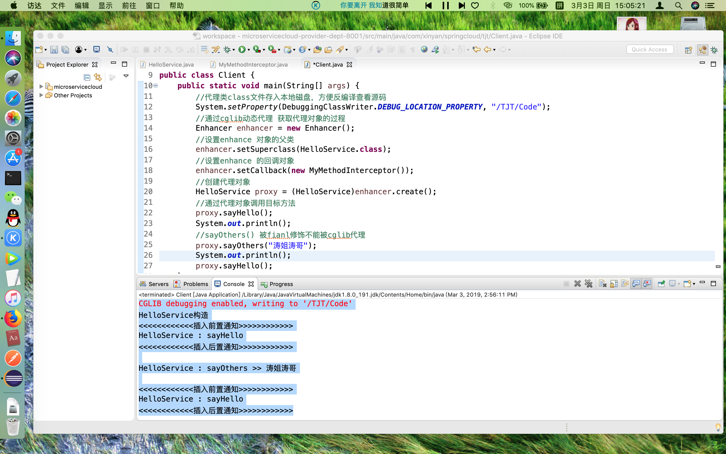 1 import org.assertj.core.internal.cglib.core.DebuggingClassWriter; 2 import org.springframework.cglib.proxy.Enhancer; 3 4 /** 5 * CGLIB代理对象调用目标方法 6 */ 7 public class Client { 8 public static void main(String[] args) { 9 //代理类class文件存入本地磁盘,方便反编译查看源码10 System.setProperty(DebuggingClassWriter.DEBUG_LOCATION_PROPERTY, "/TJT/Code");11 //通过cglib动态代理 获取代理对象的过程12 Enhancer enhancer = new Enhancer();13 //设置enhance 对象的父类14 enhancer.setSuperclass(HelloService.class);15 //设置enhance 的回调对象16 enhancer.setCallback(new MyMethodInterceptor());17 //创建代理对象18 HelloService proxy = (HelloService)enhancer.create();19 //通过代理对象调用目标方法20 proxy.sayHello();21 System.out.println();22 //sayOthers() 被fianl修饰不能被cglib代理23 proxy.sayOthers("涛姐涛哥");24 System.out.println();25 proxy.sayHello();26 }27 28 }CGLIB动态代理程序运行结果如下: