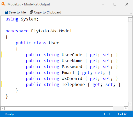 4.文件名按照一个规则自定义:每个模板可以定义一个名称规则,如上文的 {0}Model.cs 则会生成文件 UserModel.cs 。