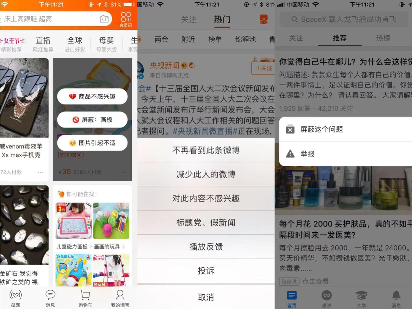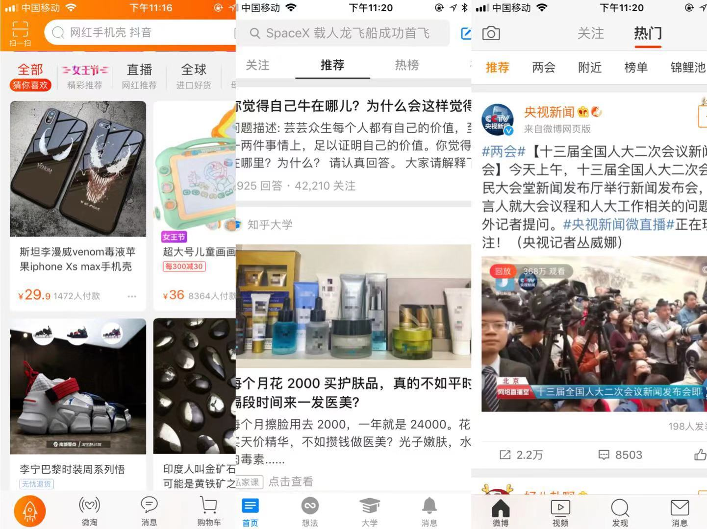 目前推荐技术的应用已经非常较普及了,新闻、商品、问答、音乐,几乎都会用到推荐算法来为你呈现内容。下面是淘宝、知乎、微博三个app的推荐模型,可以看到推荐都在非常重要的位置。