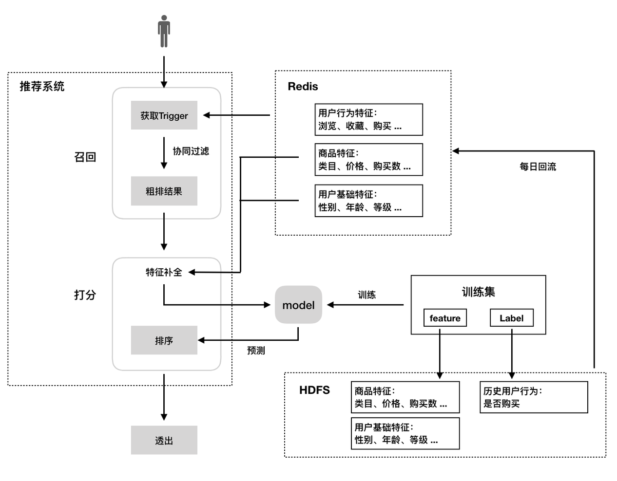 打分过程中的模型是需要提前训练和部署,训练集的来源就是用户的实时行为加上用户和商品的特征。feature的构成是用户的特征和商品的特征,label则是用户是否点击了该商品。
