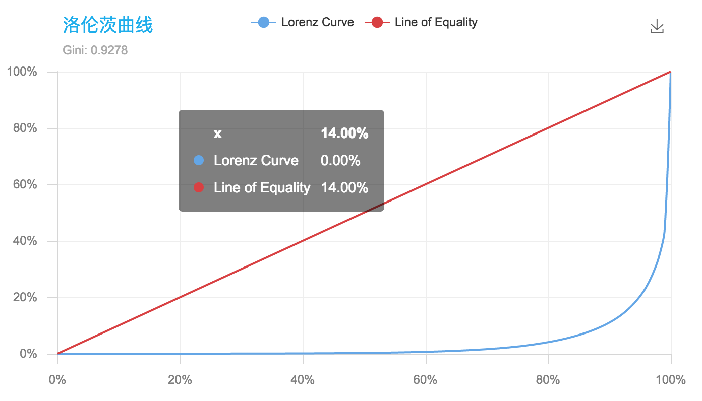 覆盖率反应出的分布情况是比较有限的,我们只能知道哪些类目覆盖了,哪些没有覆盖,那类目之间究竟哪个类目占的多,哪个类目占的少呢?为了更细致地描述推荐系统发掘长尾的能力,我们需要统计推荐列表中不同类目出现次数的分布,引入基尼系数来评价。