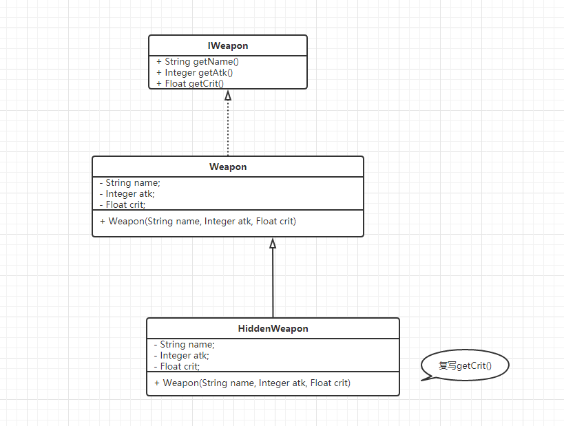 看到了吗? 我们用一个新类,暗器类,继承武器类,重写getCrit()即可,既拥抱了变化,又没有修改原来的逻辑。