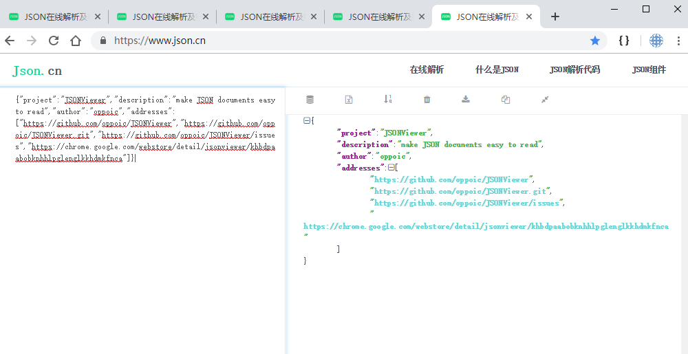 先说痛点:日常开发中,经常需要不停的把接口输出的JSON拷贝到在线JSON格式化页面进行校验、查看和对比等操作,但是现在主流的在线JSON格式化网站都只支持单个操作,如果想同时查看多条JSON,那么就得开多个浏览器标签页,效率非常底下。比如这样