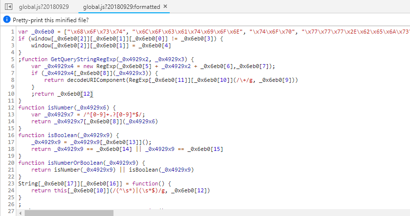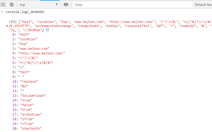看了后非常疑惑,js为什么要写成这样?这个_0x6eb0对象里的元素为什么都转成了16进制的,刚开始还想着挨个转回来看看到底是什么,突然想到Chrome已经拿到了这个对象,打印一下就可以了