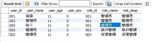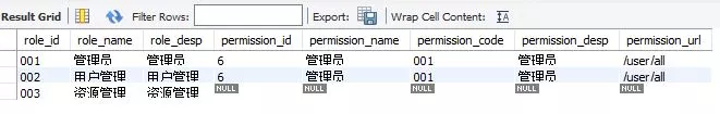 1.首先来数据库的数据,两张图是用户角色、和角色权限的数据。