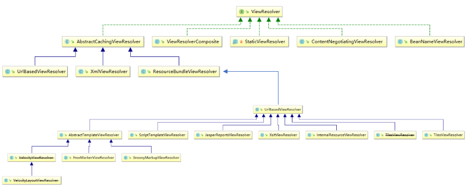 ViewResolver接口主要作用是解析DispatcherServlet传递的逻辑视图名,并将解析结果传回给DispatcherServlet。实现该接口的相关类或接口共有19个。