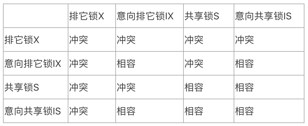 3) IX,IS是表级锁,不会和行级的X,S锁发生冲突。只会和表级的X,S发生冲突。
