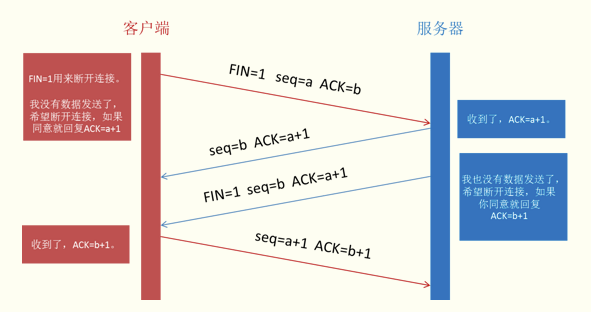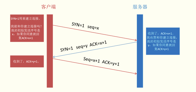 三次握手:为了准确无误的将数据包送到目的处,会采用三次握手策略。发送端首先会发送一个带有SYN标志的数据包给对方,对方接收后,会回传一个带有SYN/ACK标志的数据包,表达确认信息。发送端在回传一个带有ACK标志的数据包,表示结束。如果某一个阶段莫名其妙的中断,TCP会按照相同的顺序继续发送相同的数据包。