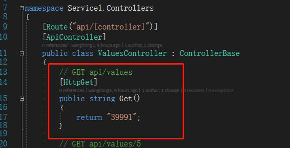 打开默认生成的/api/Values控制器Action,改造原来的Get方法返回值,让其对应三个端口以便提高区分度
