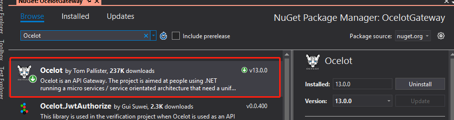 2. 该项目引入Nuget: Ocelot 最新稳定版