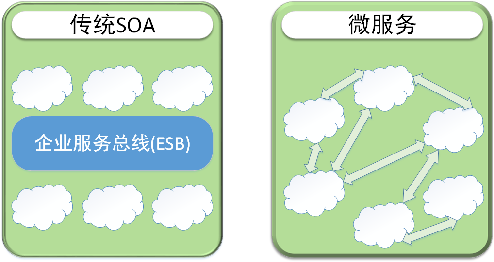 微服务与SOA的区别(由于很多场景下,SOA会使用到ESB,放在这里也方便与微服务做更好的比较,多说一句,ESB逐渐被P2P的虚拟总线所替代),如下图所示