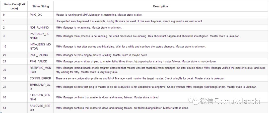拓展:masterha_check_status 可能会返回的状态值及其对应的解释如下表