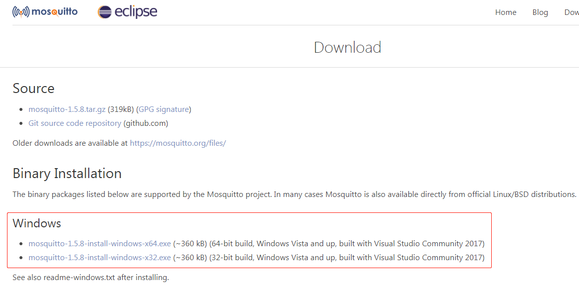 官方后面提供了比较稳定的window安装版本,安装完成后可以直接使用,并且自动添加成 windows服务,非常方便,下载路径:https://mosquitto.org/download