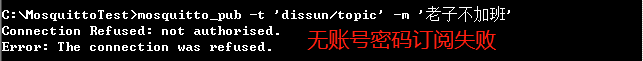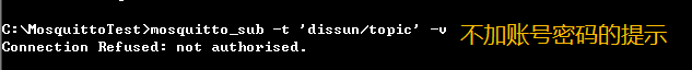然后启动第二个cmd窗口订阅'dissun/topic'主题(其中dissun是账号,111111是密码):mosquitto_sub -u dissun -P 111111 -t 'dissun/topic' -v