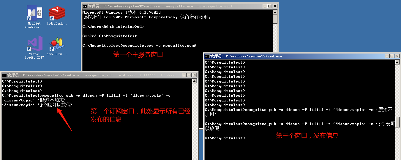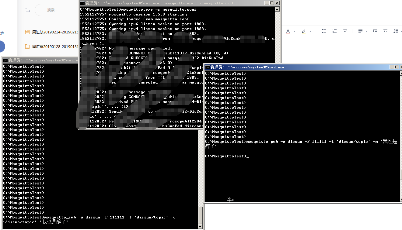 最后启动第三个cmd窗口发布订阅'腰疼不加班'信息:mosquitto_pub -u dissun -P 111111 -t 'dissun/topic' -m '腰疼不加班'