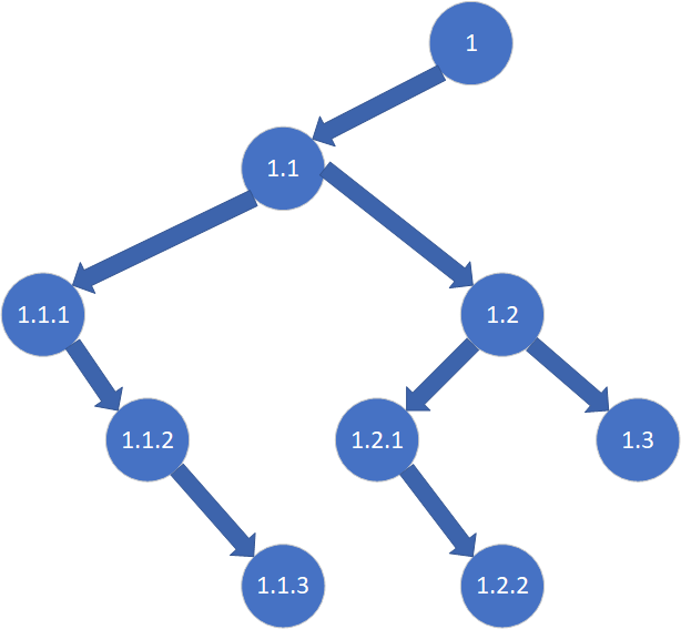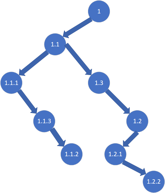 好,二叉树节点定义好了,对二叉树进行处理的前提,是先要构造二叉树。数据结构中,有一种普通树状结构转为二叉树的方式是,第一个子节点作为左子树,剩余兄弟节点,都作为上一个子节点的右子树存在,也就是说,左子树子节点,右子树兄弟节点。假如我们有这么几个数据节点:1,1.1,1.1.1,1.1.2,1.1.3,1.2,1.2.1,1.2.2,1.3,则构建完成之后,二叉树应该是这样子的: