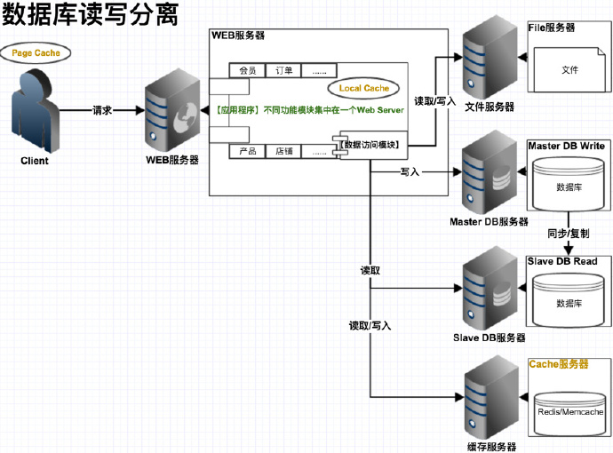 技术点:数据库主从同步部署,扩展数据访问模块,实现读写分离;