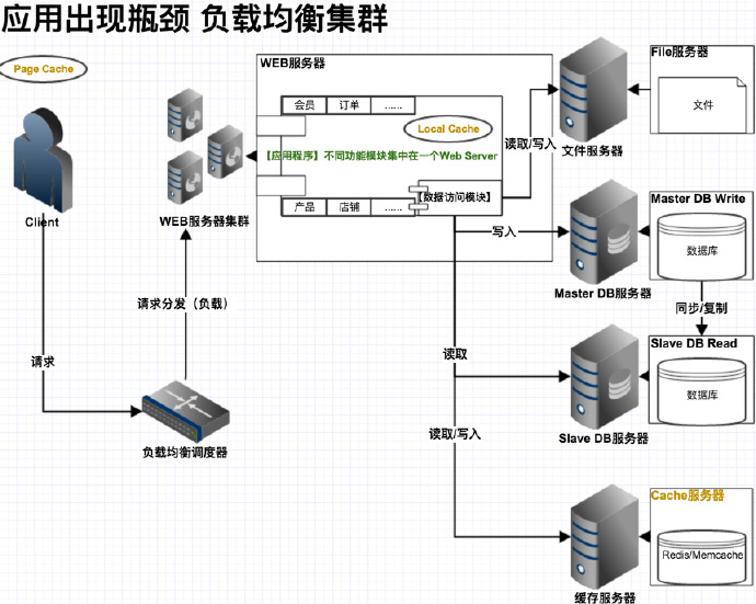 通过集群解决高并发、海量数据问题的常用手段,实现系统的可伸缩性。通过负载均衡调度器,可将用户访问分发到集群中的某台 Server 上,应用服务器的负载压力不再成为整个网站的瓶颈。