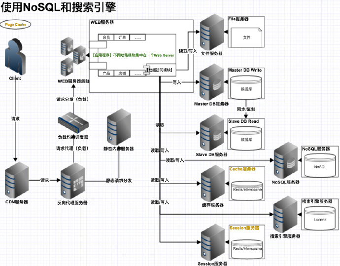 到这里,已经基本做到了DB层面和应用层面的横向扩展了,可以开始关注一些其它方面,例如:站内搜索的精准度,对DB的依赖,开始引入全文索引、NoSQL。