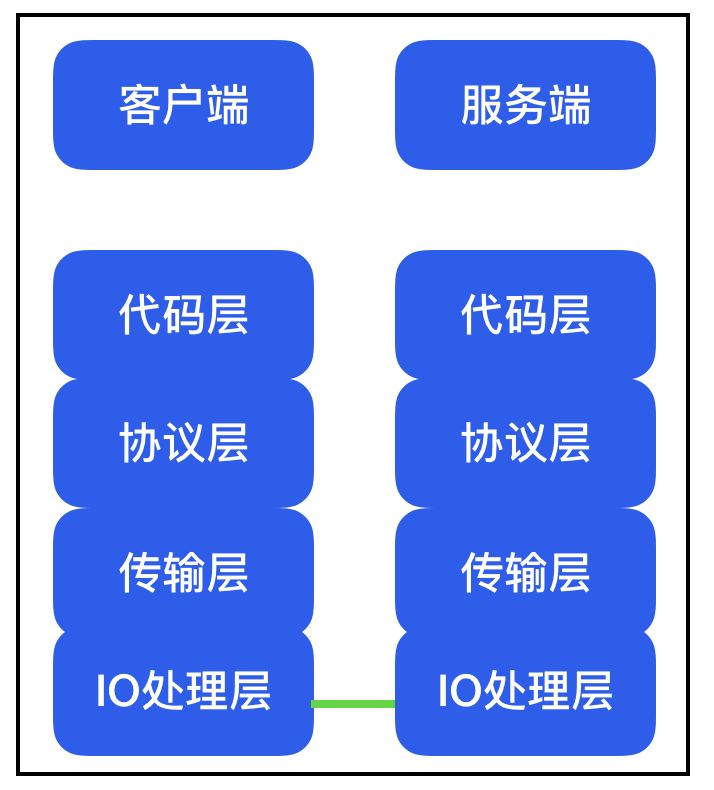 Thrift内部的架构是分层次的。客户端和服务端都可大体分为代码层、协议层、传输层、IO处理层四部分。客户端和服务端的IO处理层直接交互。