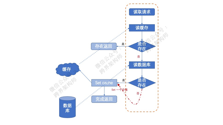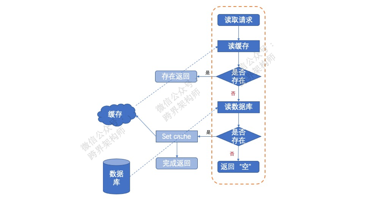 「缓存穿透」有时也叫做「缓存击穿」,产生的逻辑过程是这样,一直在虚线范围内流转。