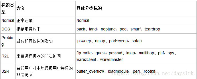一个网络连接定义为在某个时间内从开始到结束的TCP数据包序列,并且在这段时间内,数据在预定义的协议下(如TCP、UDP)从源IP地址到目的IP地址的传递。每个网络连接被标记为正常(normal)或异常(attack),异常类型被细分为4大类共39种攻击类型,其中22种攻击类型出现在训练集中,另有17种未知攻击类型出现在测试集中。