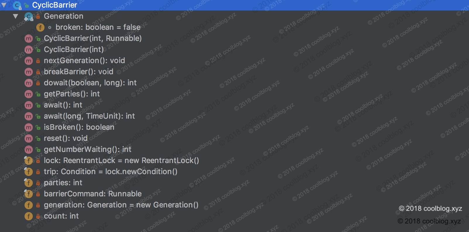 如前面所说,CyclicBarrier 是基于重入锁 ReentrantLock 实现相关逻辑的。所以要弄懂 CyclicBarrier 的源码,仅需有 ReentrantLock 相关的背景知识即可。关于重入锁 ReentrantLock 方面的知识,有兴趣的朋友可以参考我之前写的文章 Java 重入锁 ReentrantLock 原理分析。下面看一下 CyclicBarrier 的代码结构吧,如下: