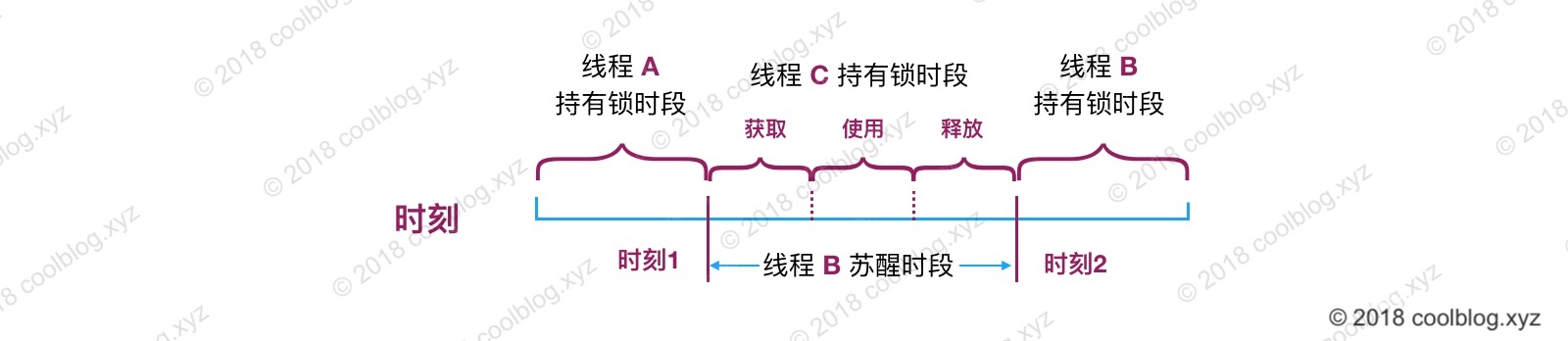 如上图,线程 C 在线程 B 苏醒阶段内获取和使用锁,并在线程 B 获取锁前释放了锁,所以线程 B 可以顺利获得锁。线程 C 在抢占锁的情况下,仍未影响线程 B 获取锁,因此是个“双赢”的局面。