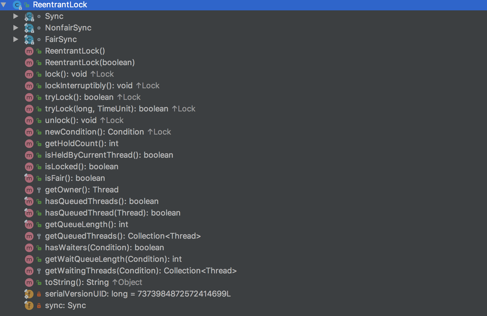 上图中,Sync是一个静态抽象类,继承了 AbstractQueuedSynchronizer。公平和非公平锁的实现类NonfairSync和FairSync则继承自 Sync 。至于 ReentrantLock 中的其他一些方法,主要逻辑基本上都在几个内部类中实现的。