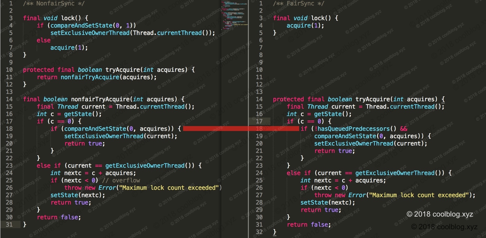 如果大家之前阅读过公平锁和非公平锁的源码,会发现两者之间的差别不是很大。为了找出它们之间的差异,这里我将两者的对比代码放在一起,大家可以比较一下,如下:
