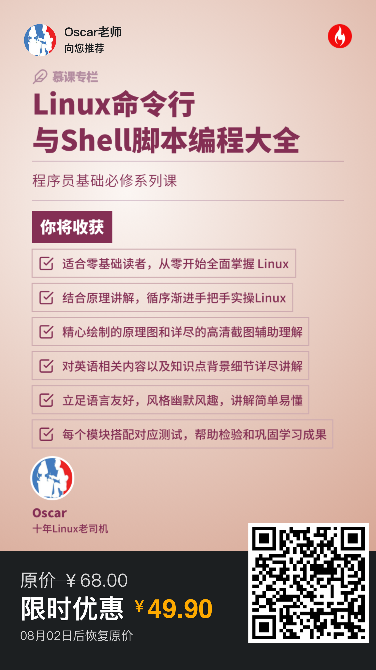 我是专栏作者 Oscar 老师,拥有 8 年以上工作经验的高级软件工程师,曾就职过英特尔等多个国际大厂。专业是嵌入式软件,拥有十几年的 Linux 使用经验。自媒体人,终生学习者,写过很多深受大家喜爱的编程文章,在慕课网拥有多个人气原创视频课程。