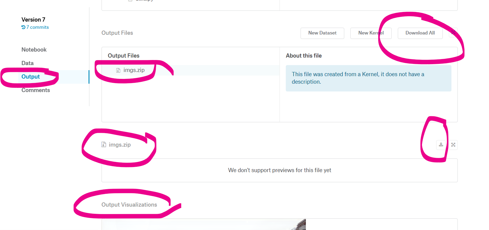 这样,如果直接 Commit 在你的 kaggle 页面将可以看到 imgs 下的图片的可视化,但是无法下载。