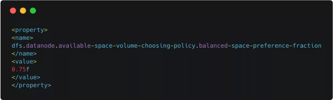 默认值是0.75f,一般使用默认值就行。官方解释为,有多少比例的数据副本应该存储到剩余空间足够多的磁盘上。该配置项取值范围是0.0-1.0,一般取0.5-1.0,如果配置太小,会导致剩余空间足够的磁盘实际上没分配足够的数据副本,而剩余空间不足的磁盘取需要存储更多的数据副本,导致磁盘数据存储不均衡。