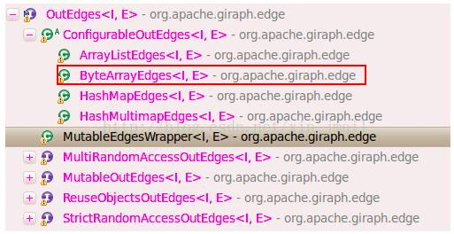 3.org.apache.giraph.edge.OutEdges 用于存储每个顶点的out-edges。从Vertex类的定义可知,顶点的每条边都被存储在OutEdges类型的edge对象中,OutEdges接口的关系图如下: