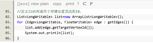 Giraph默认的使用ByteArrayEdges<I,E>,每个顶点的所有边都被存储在byte[ ]中。当顶点向它的出边发送消息时,需要遍历Vertex类中的edges对象。示例代码如下: