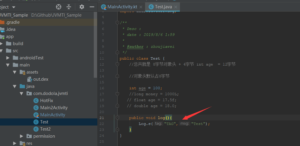 重点就是这句话JVMTIHelper.redefineClass(Test::class.java, dexbyte)调用了jni封装的jvmti的redefineClass方法